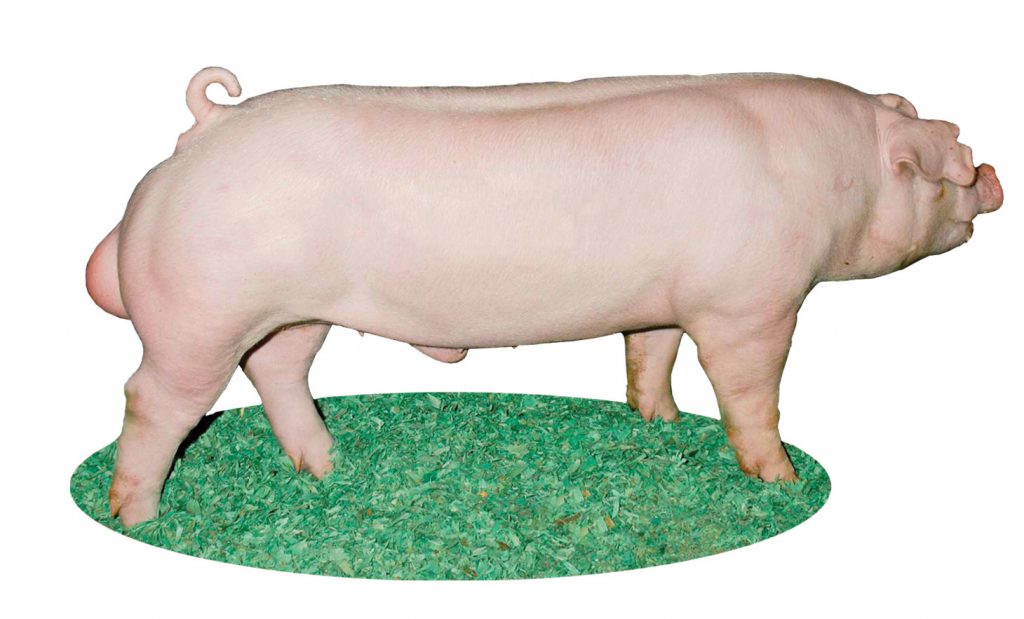 The Yorkshire breed is known as the “Mother Breed” because Yorkshire sows characteristically farrow and raise large litters of pigs. Yorkshires are large-framed hogs, particularly in length, which allows them to be marketed at heavier weights without loss of efficiency. The Yorkshire barrows, in years of National Barrow Show records, average more than 32 inches in the carcass contest, consistently longer than any other breed and even longer than crossbreds. A five-year boar test station average of Yorkshire boars when taken to 240 pounds, gained an average of 2.07 per day with feed efficiency of 2.55, tops in both categories for all breeds.
